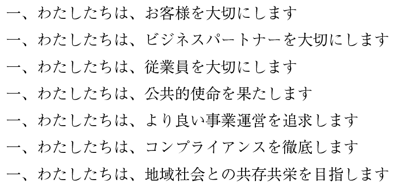 - 法令、社内ルールを遵守し、良識に従い業務を遂行します